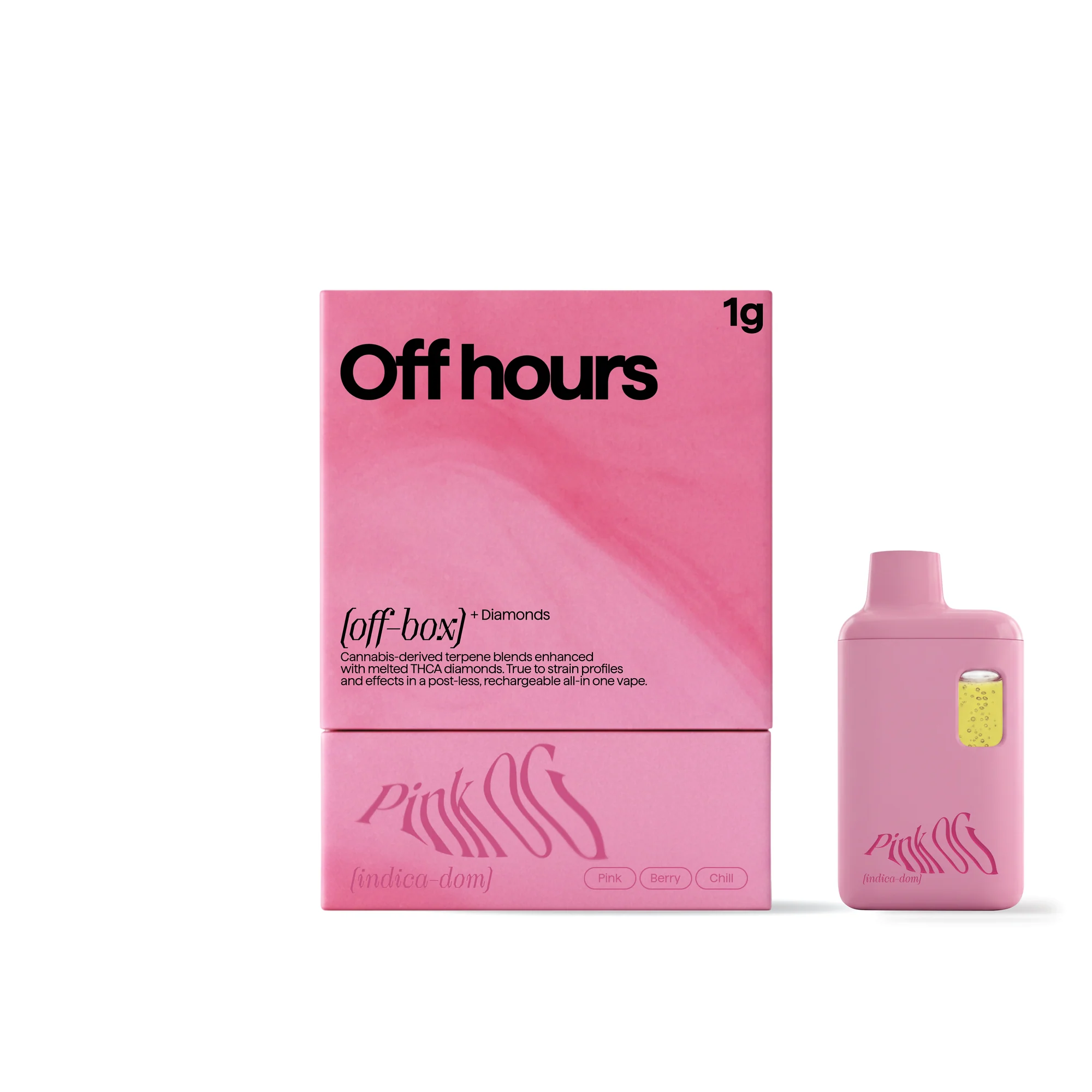 Off Hours’ all-new off-box all-in-ones deliver concentrated potency in a hard-hitting, compact design. Formulated with cannabis-derived terpene blends and melted THCA diamonds for powerful, true-to-strain effects in a postless + rechargeable all-in-one.